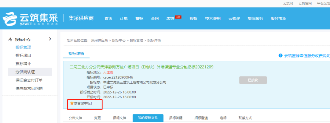 中建二局三北方分公司天津静海万达广场项目(E地块)外墙保温专业分包招标工作圆满结束。经评标委员会评定和招标工作小组定标,北涂建工集团有限公司为中标单位。中标标的:专业分包价税分离合同清单 。